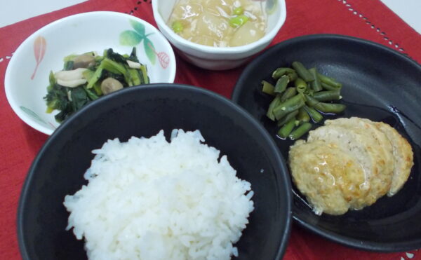 夕食 ご飯 手作り鶏つくね 冬瓜の薄くず煮 小松菜のポン酢和え