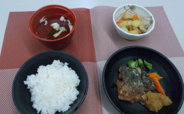 昼食 アジの竜田揚げ 鶏肉とじゃが芋の煮物 清汁(しめじ・貝割れ)