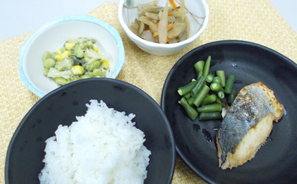 夕食 ご飯 さわらの利休焼き 金平ごぼう 枝豆とコーンのサラダ