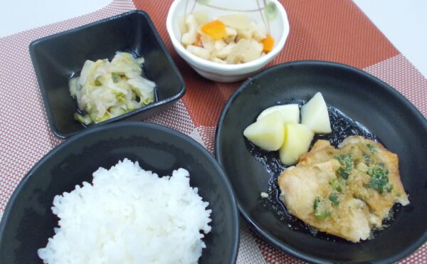 夕食 ご飯 鶏肉のねぎソースかけ ちくわの甘辛煮 白菜の梅和え
