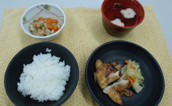 昼食 ご飯 鶏の照り焼き 五目煮 清汁(花麩・三つ葉)