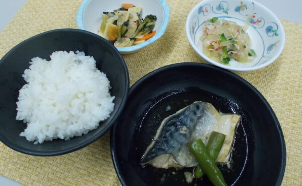 夕食 ご飯 鯖の煮付け 浅利と野菜の酒蒸し 大根サラダ