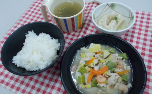 昼食 ご飯 八宝菜 水餃子 中華スープ