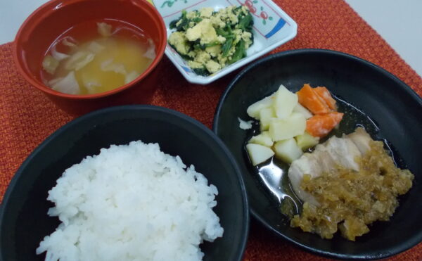 昼食 ご飯 鶏肉の香味ソース ほうれん草と卵のソテー みそ汁(キャベツ・ねぎ)