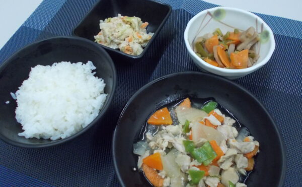 夕食 ご飯 鶏のさっぱり煮 蓮根の炒め物 ツナサラダ