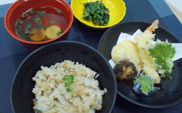 昼食 炊き込みご飯 天ぷら盛り合わせ ほうれん草のお浸し お雑煮(すまし)