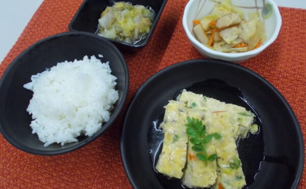夕食 ご飯 卵の五目蒸し さつま揚げとキャベツの炒め物 白菜の梅和え