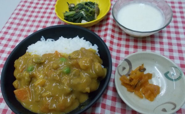 昼食 シーフードカレー 小松菜のドレッシング和え フルーツヨーグルト