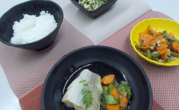 夕食 ご飯 たらの煮付け 野菜と昆布の煮物 菜種和え