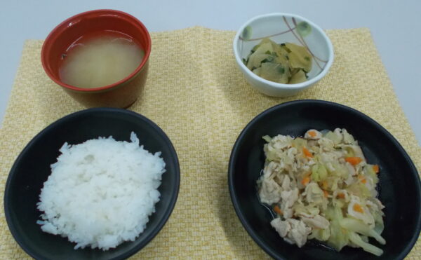 昼食 ご飯 豚肉の生姜炒め 大根の炒め煮 みそ汁(白菜・貝割れ)