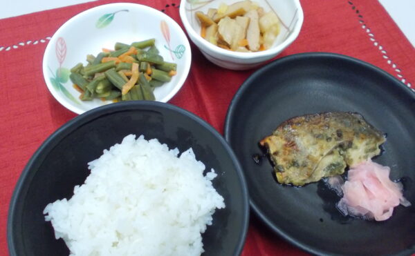 夕食 ご飯 あじのねぎ味噌焼き さつま揚げの煮物 いんげんのわさび和え