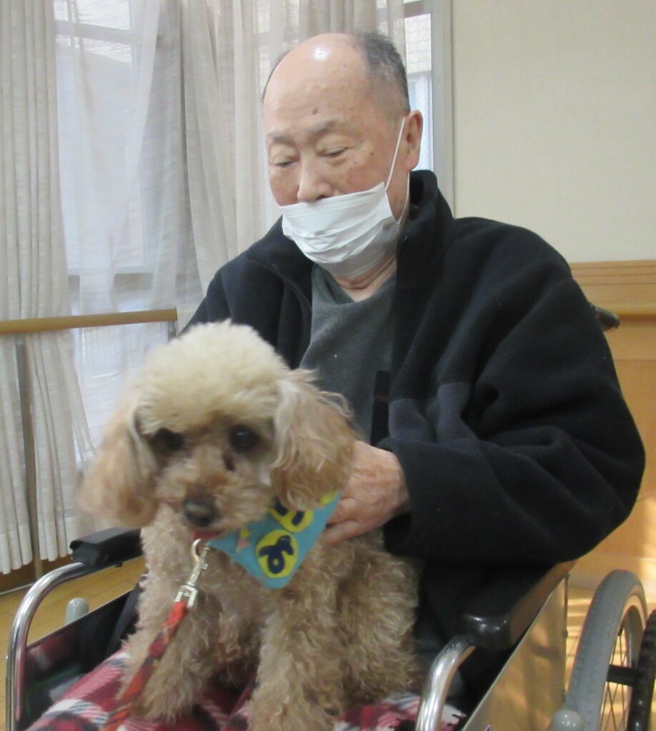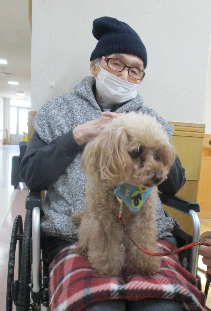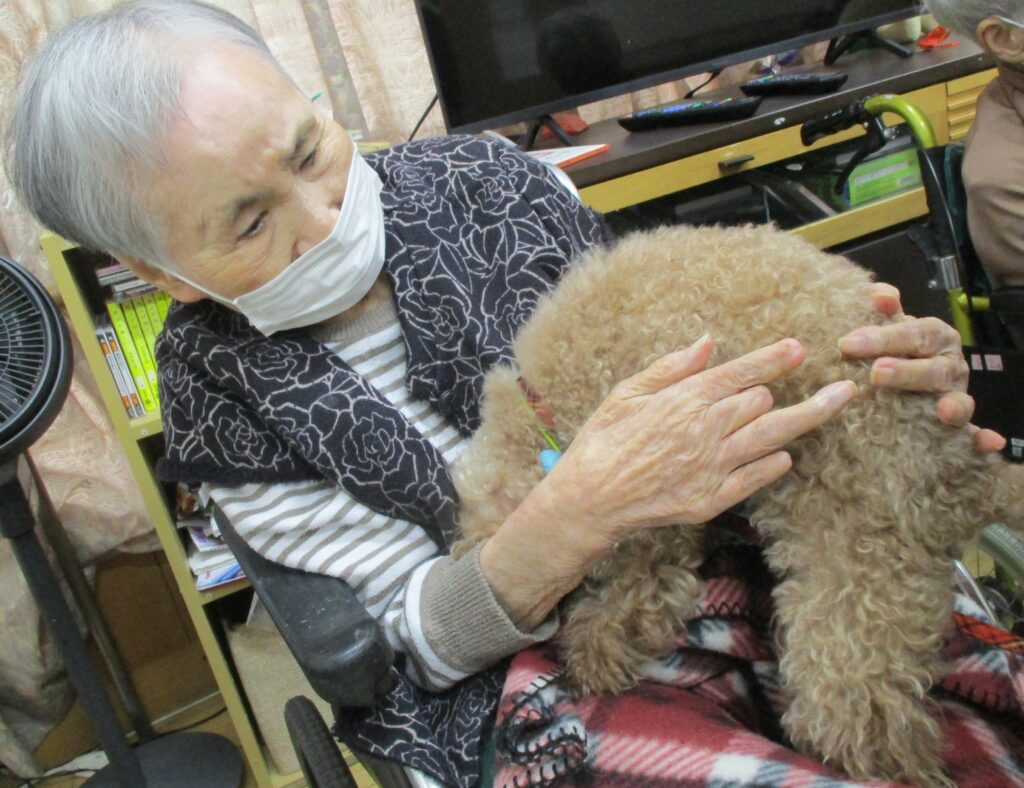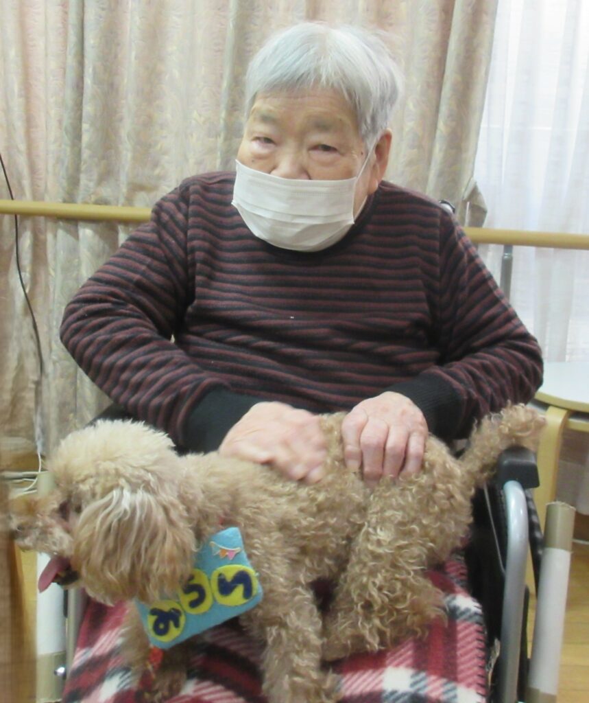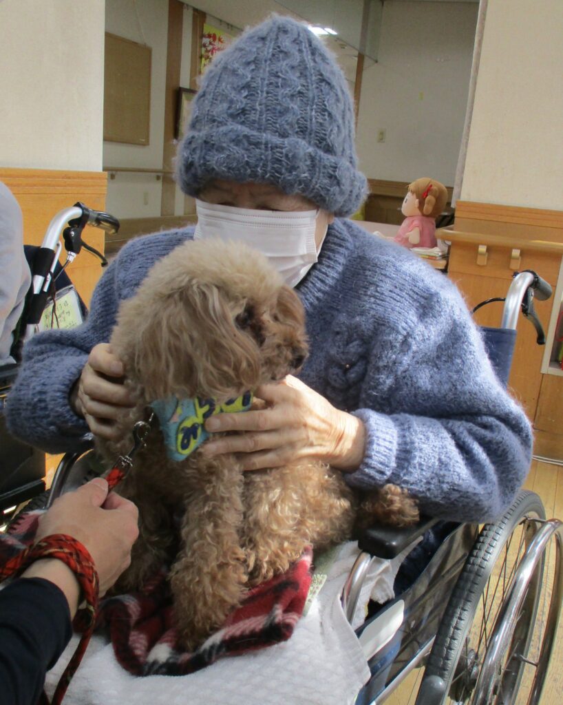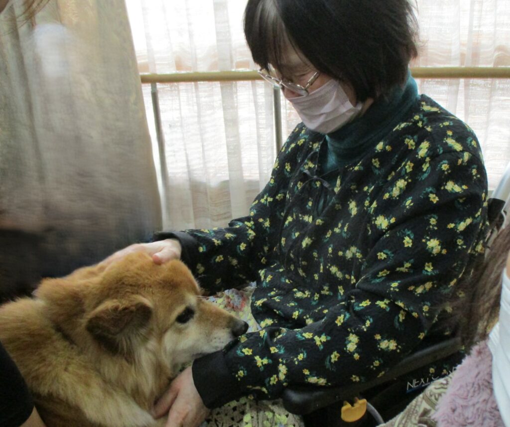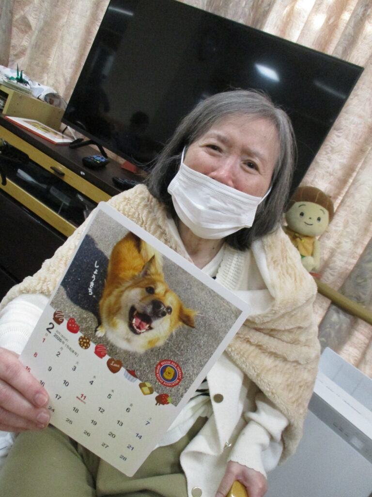 サポートの方が利用者様の膝に犬を乗せると、目を細めて優しくなでたり、抱きしめたり、優しく語りかける姿も見られ、その穏やかな表情がとても印象的で、見ている私たちまで、温かい気持ちになりました。また写真入りのカレンダーもプレゼントしてくださり、楽しいひとときを過ごすことができました。