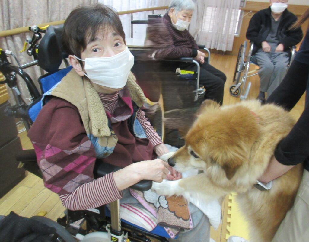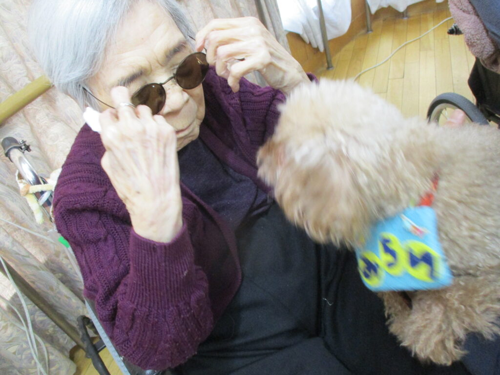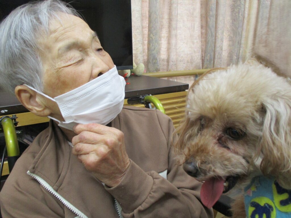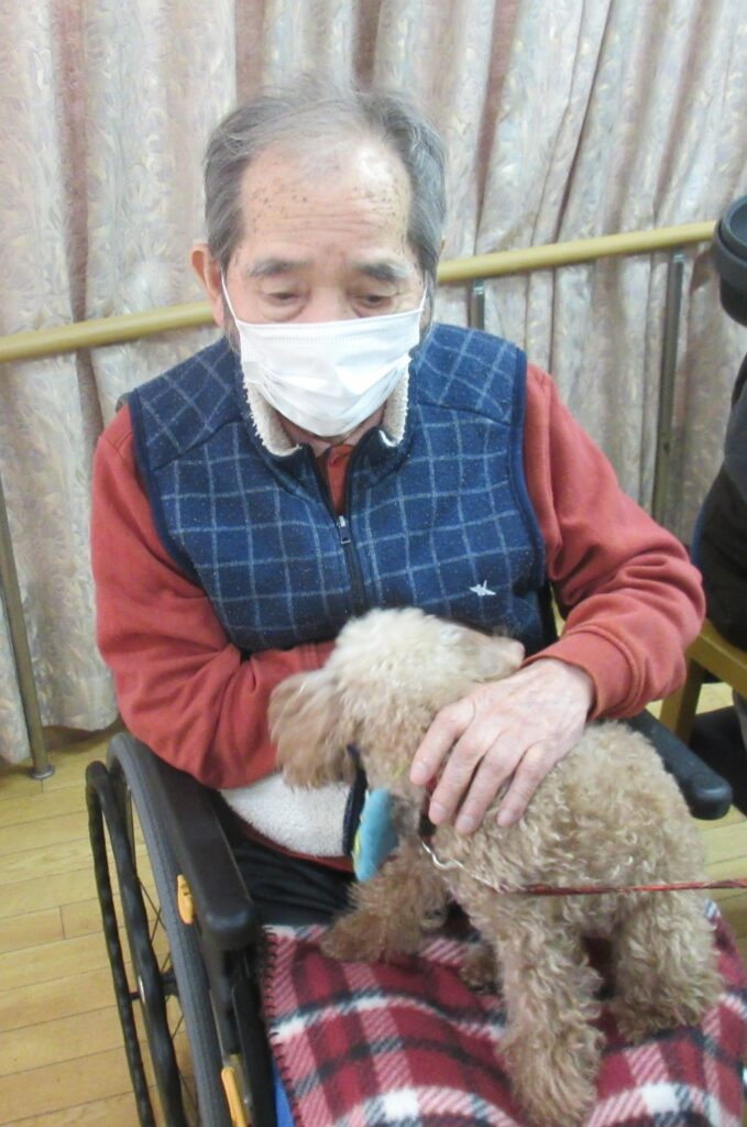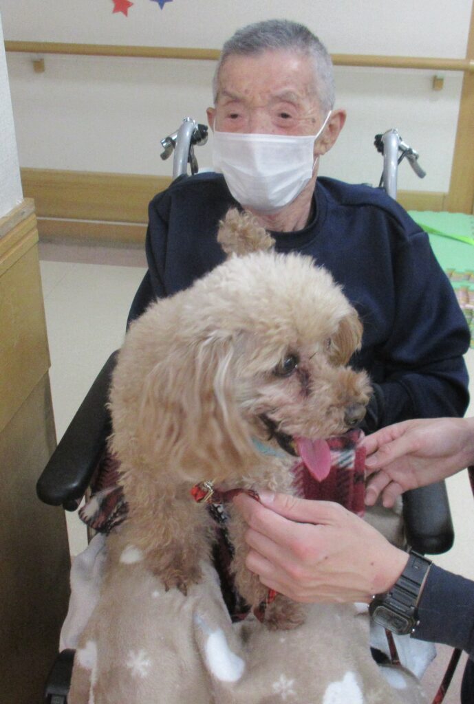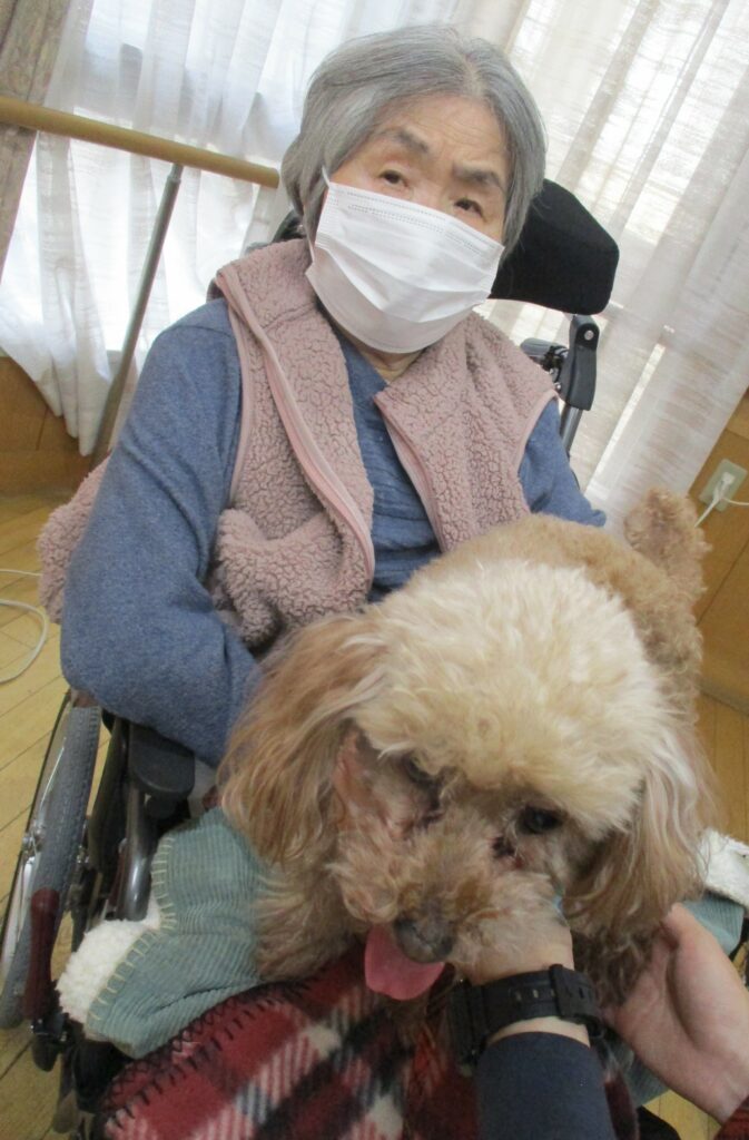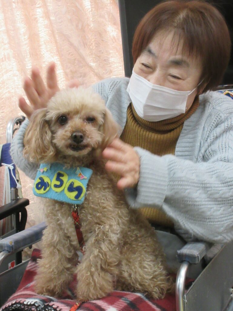 サポートの方が利用者様の膝に犬を乗せると、目を細めて優しくなでたり、抱きしめたり、優しく語りかける姿も見られ、その穏やかな表情がとても印象的で、見ている私たちまで、温かい気持ちになりました。また写真入りのカレンダーもプレゼントしてくださり、楽しいひとときを過ごすことができました。