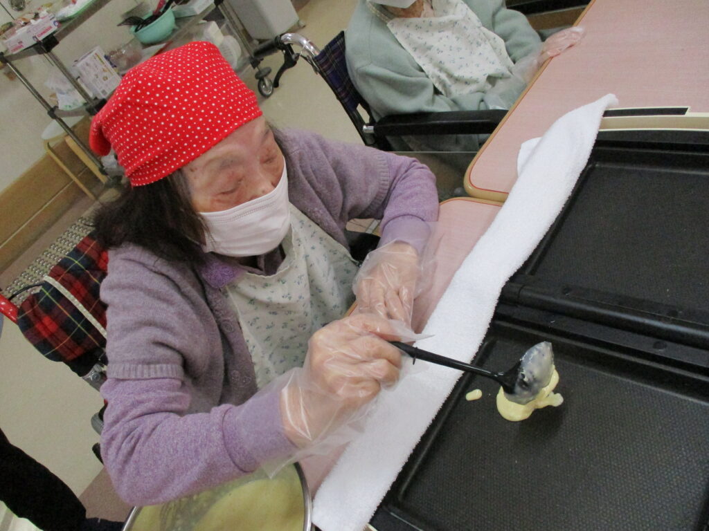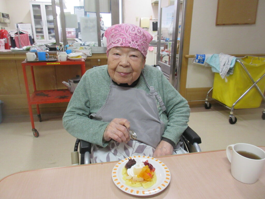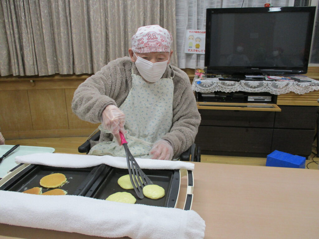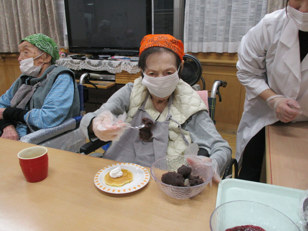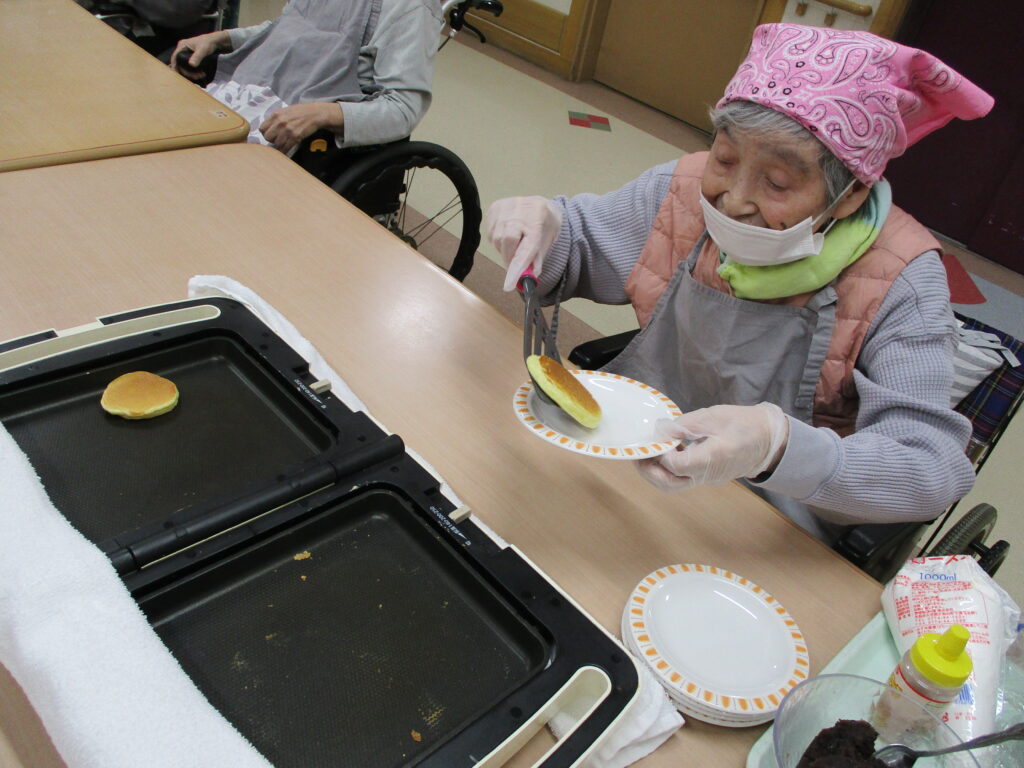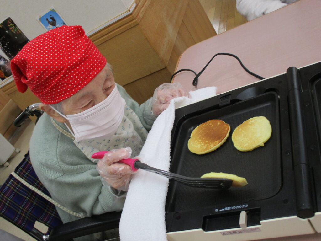 11月は寒くなってきたためホットプレートを使用し、ホットケーキを作りました。焼けてくると食欲をそそる甘い香りが感じられるのも料理クラブの醍醐味です。今回は焼きたてのホットケーキにメープルシロップ、ホイップクリーム、粒あん、いちごジャム、フルーツの中からお好きなものをトッピングして自分好みのホットケーキを食べていただきました。卵を片手で割ることができたりトッピングを全部乗せたり、おかわりされたりと皆様楽しみながら食べていただきました。