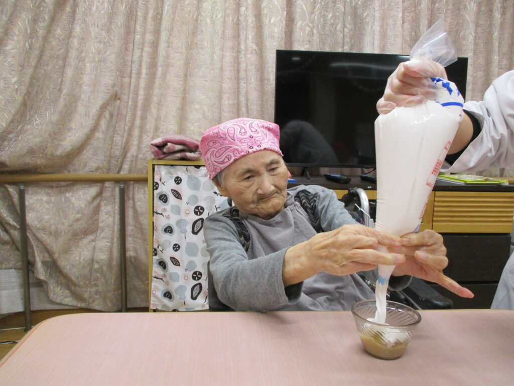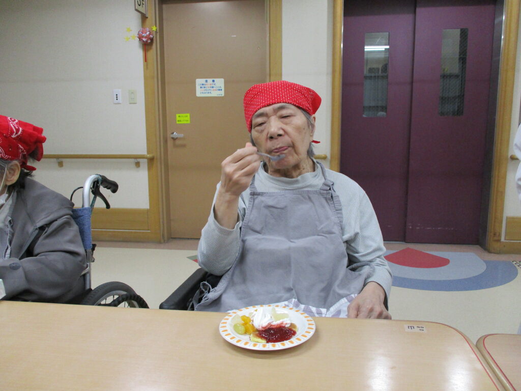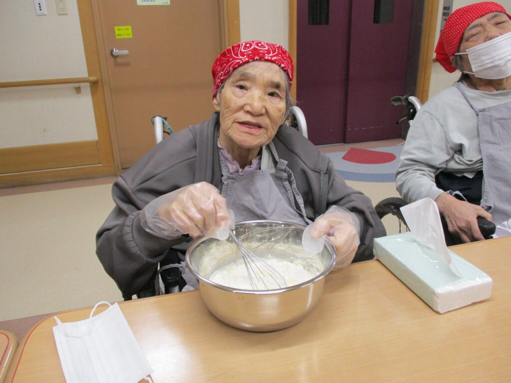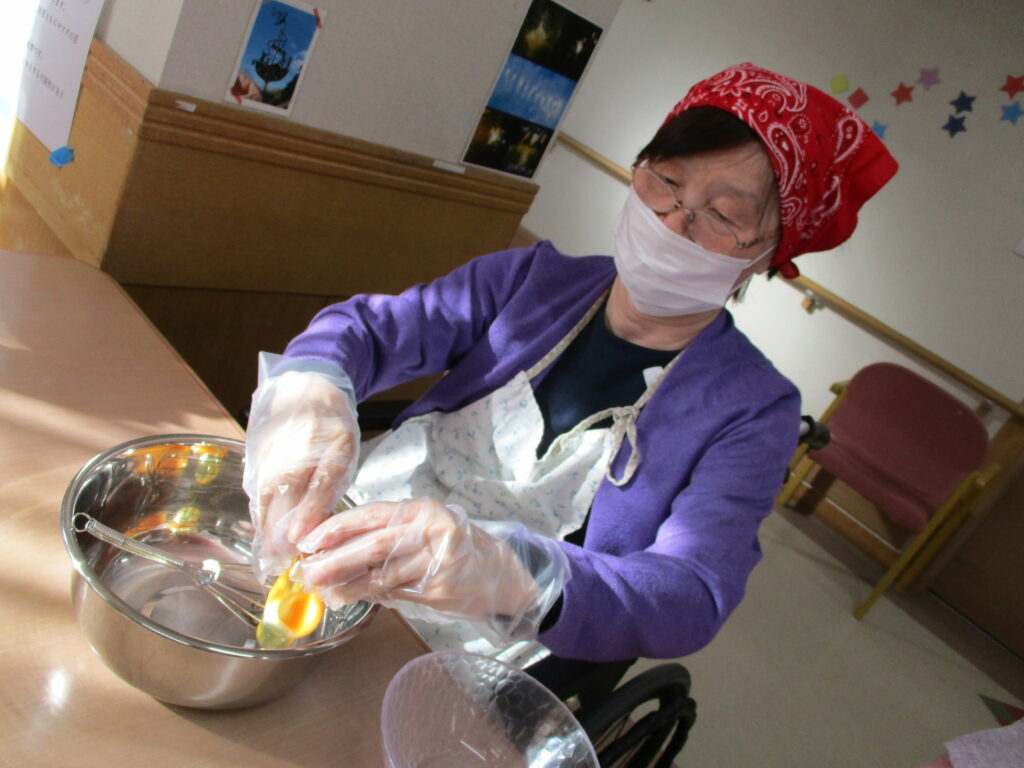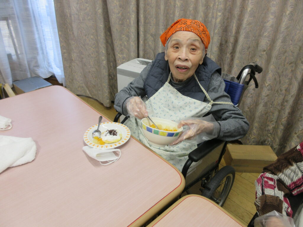 11月は寒くなってきたためホットプレートを使用し、ホットケーキを作りました。焼けてくると食欲をそそる甘い香りが感じられるのも料理クラブの醍醐味です。今回は焼きたてのホットケーキにメープルシロップ、ホイップクリーム、粒あん、いちごジャム、フルーツの中からお好きなものをトッピングして自分好みのホットケーキを食べていただきました。卵を片手で割ることができたりトッピングを全部乗せたり、おかわりされたりと皆様楽しみながら食べていただきました。