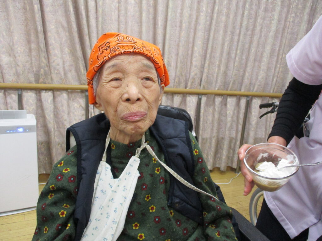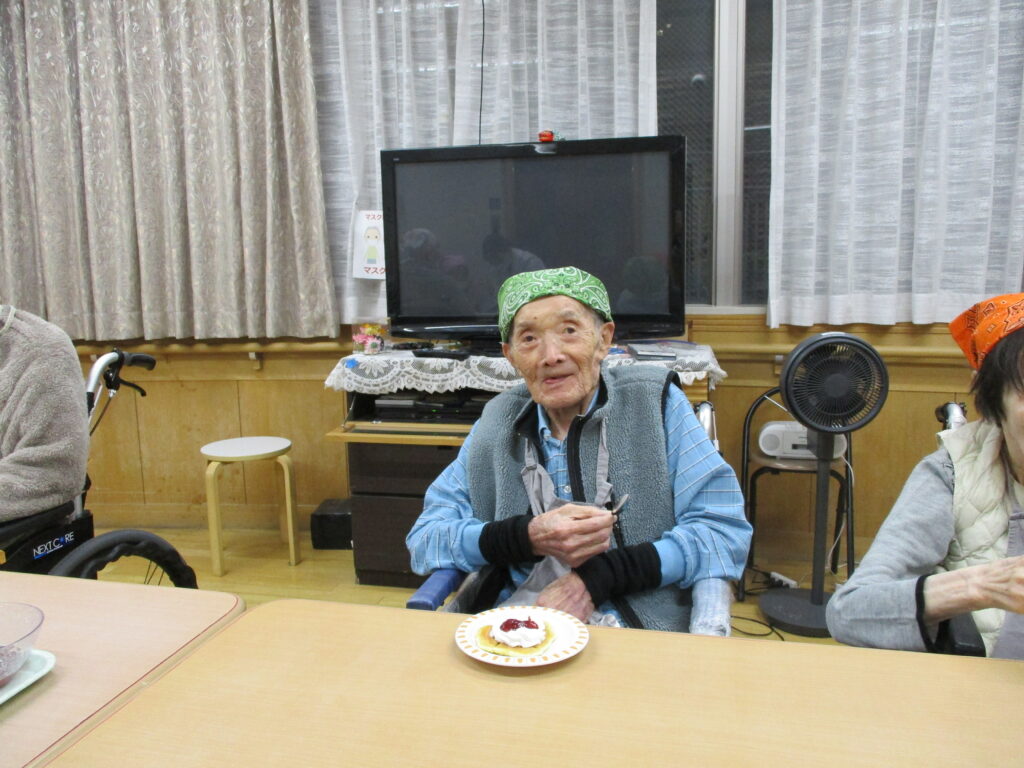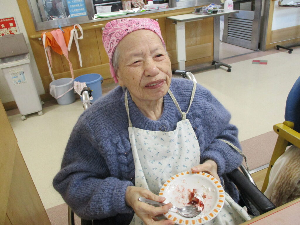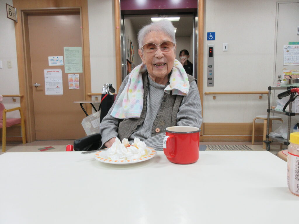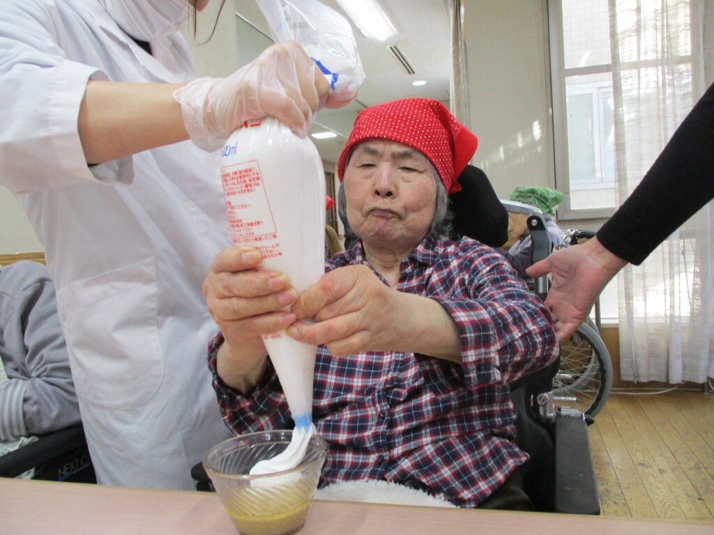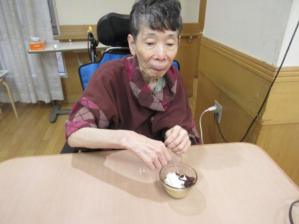 11月は寒くなってきたためホットプレートを使用し、ホットケーキを作りました。焼けてくると食欲をそそる甘い香りが感じられるのも料理クラブの醍醐味です。今回は焼きたてのホットケーキにメープルシロップ、ホイップクリーム、粒あん、いちごジャム、フルーツの中からお好きなものをトッピングして自分好みのホットケーキを食べていただきました。卵を片手で割ることができたりトッピングを全部乗せたり、おかわりされたりと皆様楽しみながら食べていただきました。