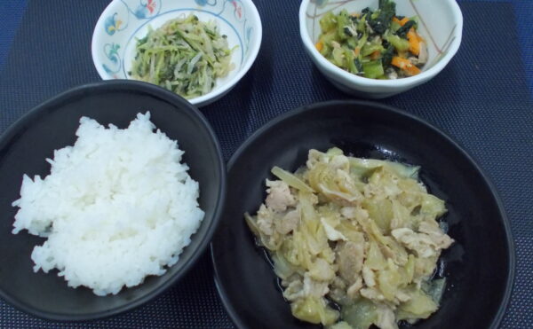 夕食 ご飯 豚肉の香味炒め 小松菜の煮浸し 豆苗の和え物