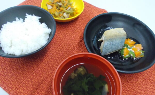 昼食 ご飯 鯵の酢醤油煮 ピーマンとしめじの炒め物 清汁(ほうれん草・椎茸)