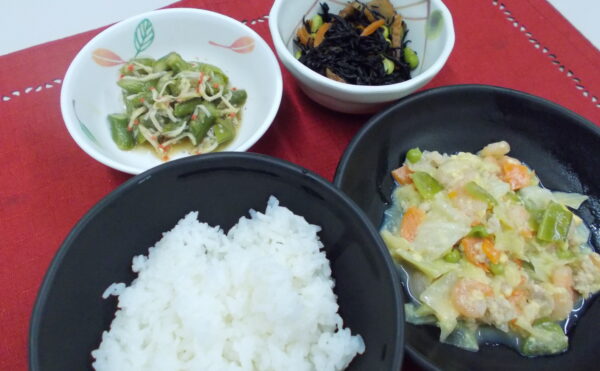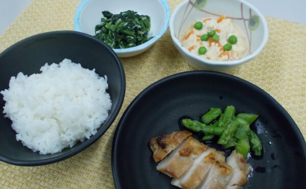 夕食 ご飯 鶏肉の梅風味焼き 炒り豆腐 ほうれん草のしらす和え