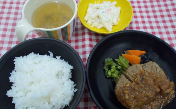 昼食 ご飯 ハンバーグのきのこデミグラスソース マカロニサラダ コンソメスープ