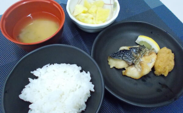 夕食 ご飯 鯖の塩焼き さつまいもの甘煮 みそ汁(玉葱・ねぎ)