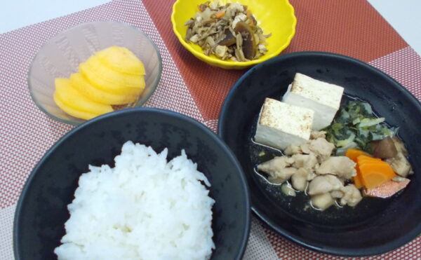 昼食 ご飯 かしわすき焼き 奈良和え フルーツ(柿) 〈郷土料理 奈良県〉