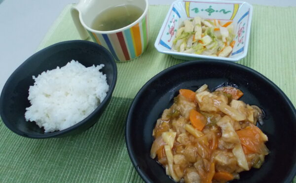 昼食 ご飯 酢鶏 白菜の煮物 中華スープ