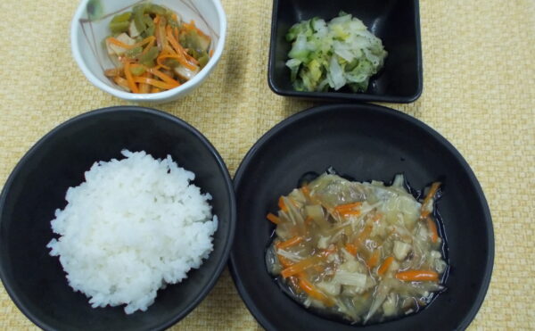 夕食 ご飯 たらの野菜あんかけ ピーマンの金平風 白菜のゆかり和え