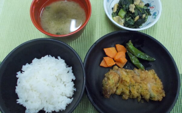 昼食 ご飯 鶏の磯辺揚げ チンゲン菜のソテー みそ汁(とろろ・ねぎ)