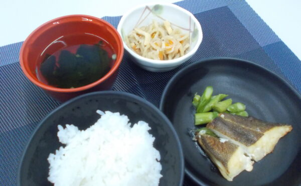 昼食 ご飯 メルルーサの利休焼き チンゲン菜の炒め物 みそ汁(ささがき・きぬさや)