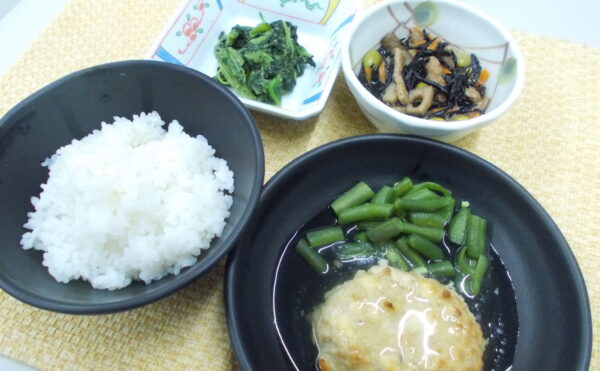 夕食 ご飯 手作り鶏つくね 五目煮 ほうれん草のごま和え