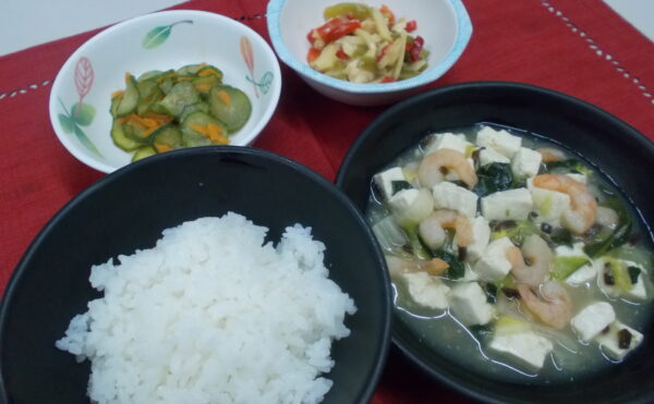 夕食 ご飯 豆腐と海老の中華煮 チンジャオロース 胡瓜のドレッシング和え