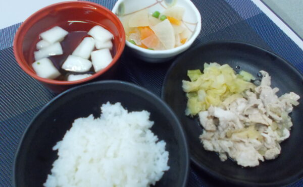 昼食 ご飯 部手肉の生姜炒め 大根の味噌煮 清汁(はんぺん・ねぎ)