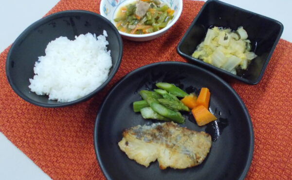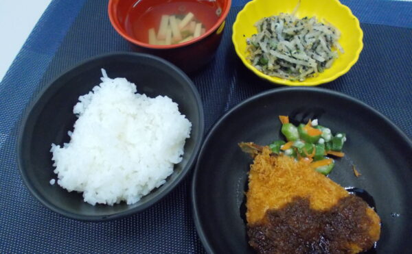 昼食 ご飯 メルルーサの和風ムニエル ちくわと冬瓜の煮物 清汁(オクラ・椎茸)