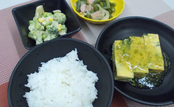 夕食 ご飯 千草焼き いんげんの炒め物 枝豆とコーンのサラダ