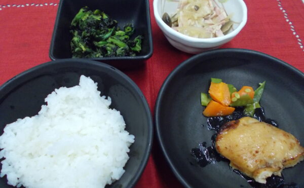 夕食 ご飯 鶏肉の漬け焼き ベーコンときのこの炒め物 菜の花の和え物