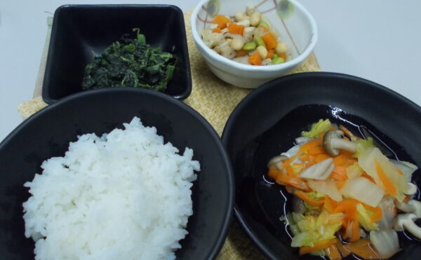 夕食 ご飯 たらちり風 五目煮 ほうれん草のごま和え
