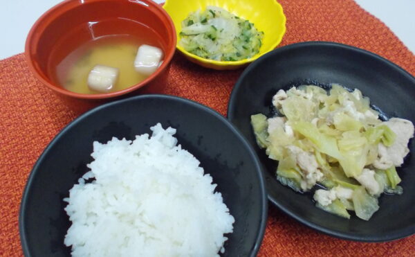 昼食 ご飯 豚肉の生姜炒め 白菜のゆかり和え みそ汁(麩・ねぎ)