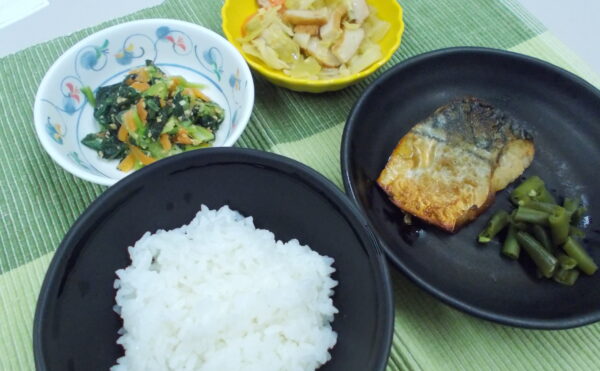 夕食 ご飯 鯖の香味焼き キャベツの炒め煮 小松菜のピーナッツ和え
