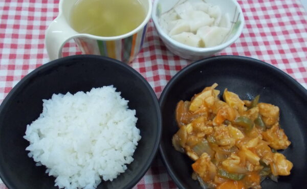 昼食 ご飯 酢鶏 水餃子 中華スープ