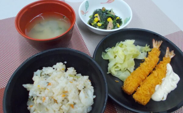 昼食 豚バラ大根の炊き込みご飯 海老フライ ほうれん草の炒め物 みそ汁(わかめ・ねぎ)