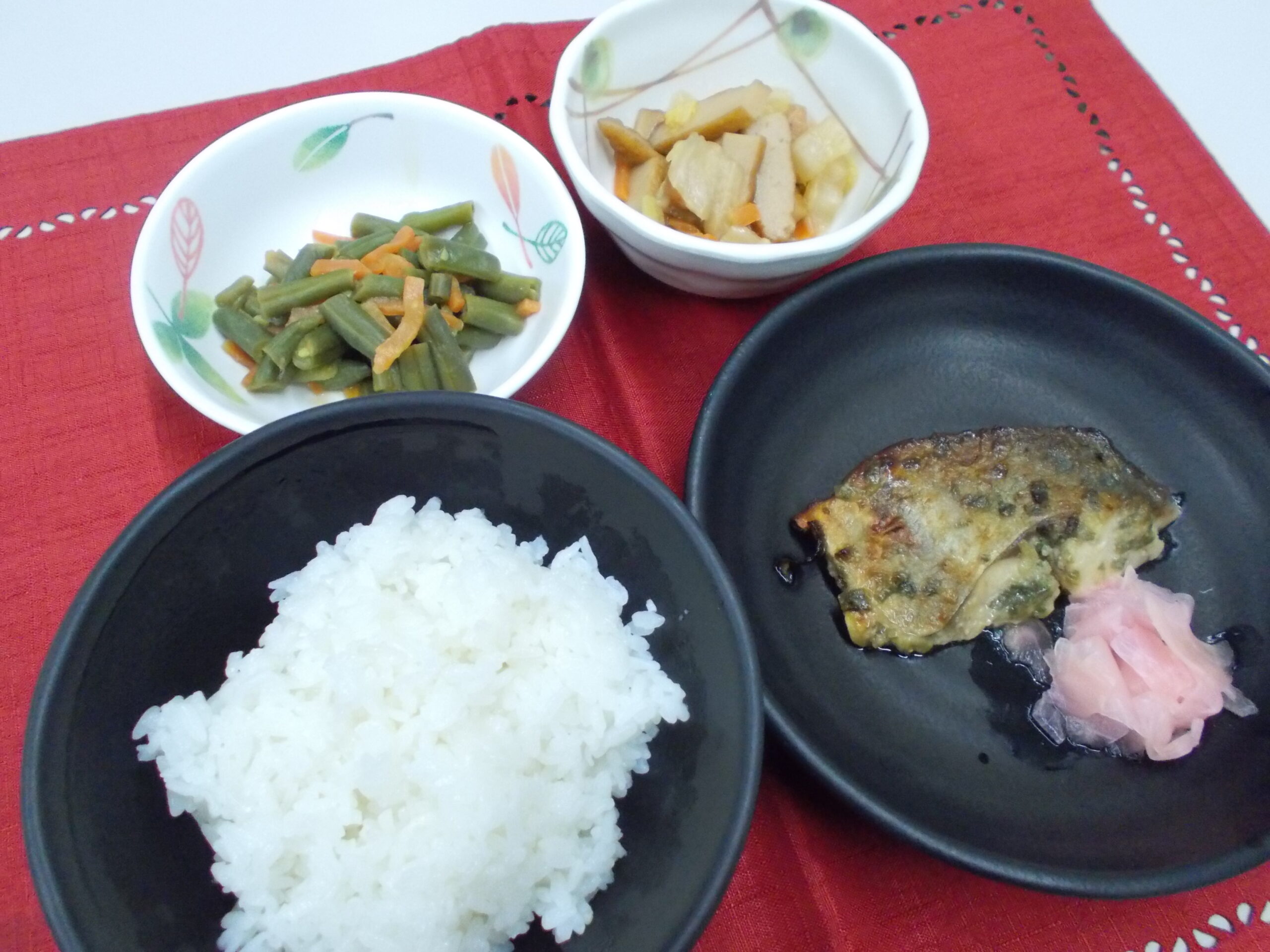 夕食 ご飯 あじのねぎ味噌焼き さつま揚げの煮物 いんげんのわさび和え