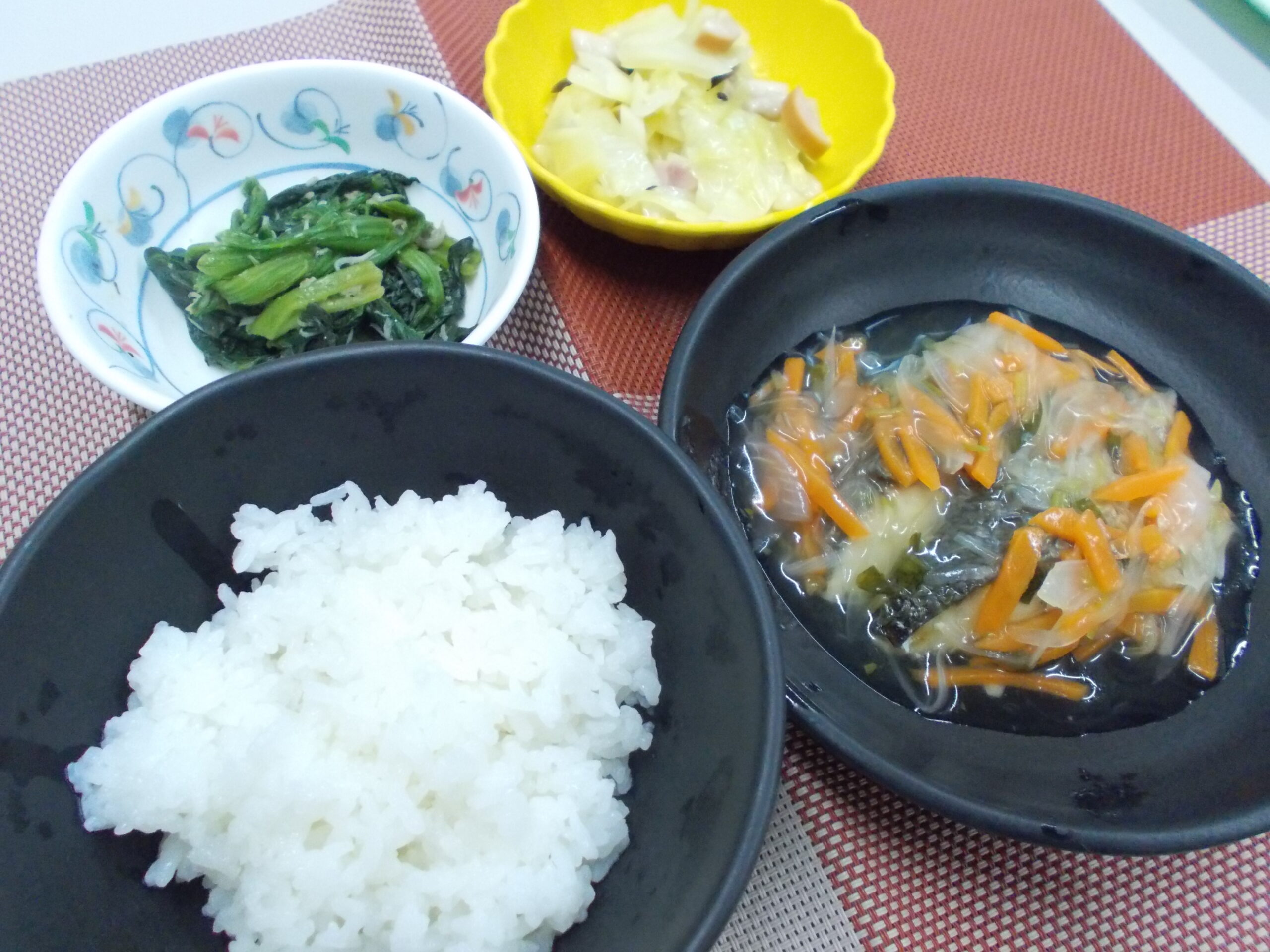 夕食 ご飯 あじの野菜あんかけ キャベツの炒め物 ほうれん草の海苔和え