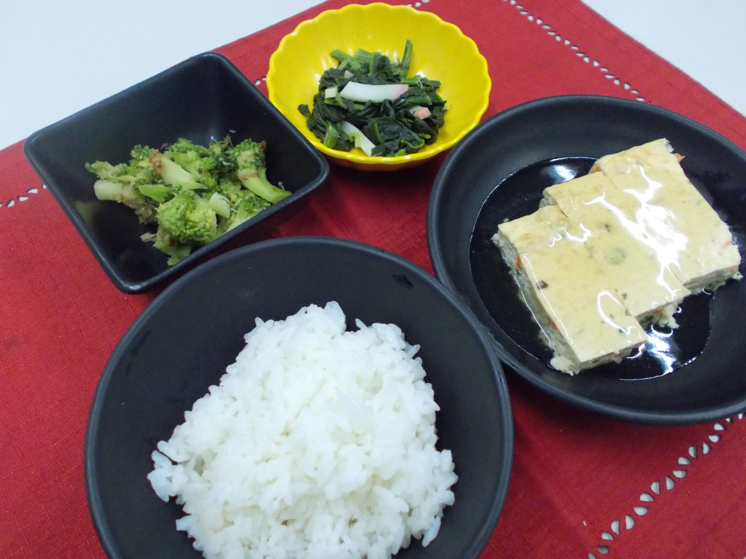 夕食 ご飯 ぎせい豆腐 ほうれん草のソテー ブロッコリーの生姜和え