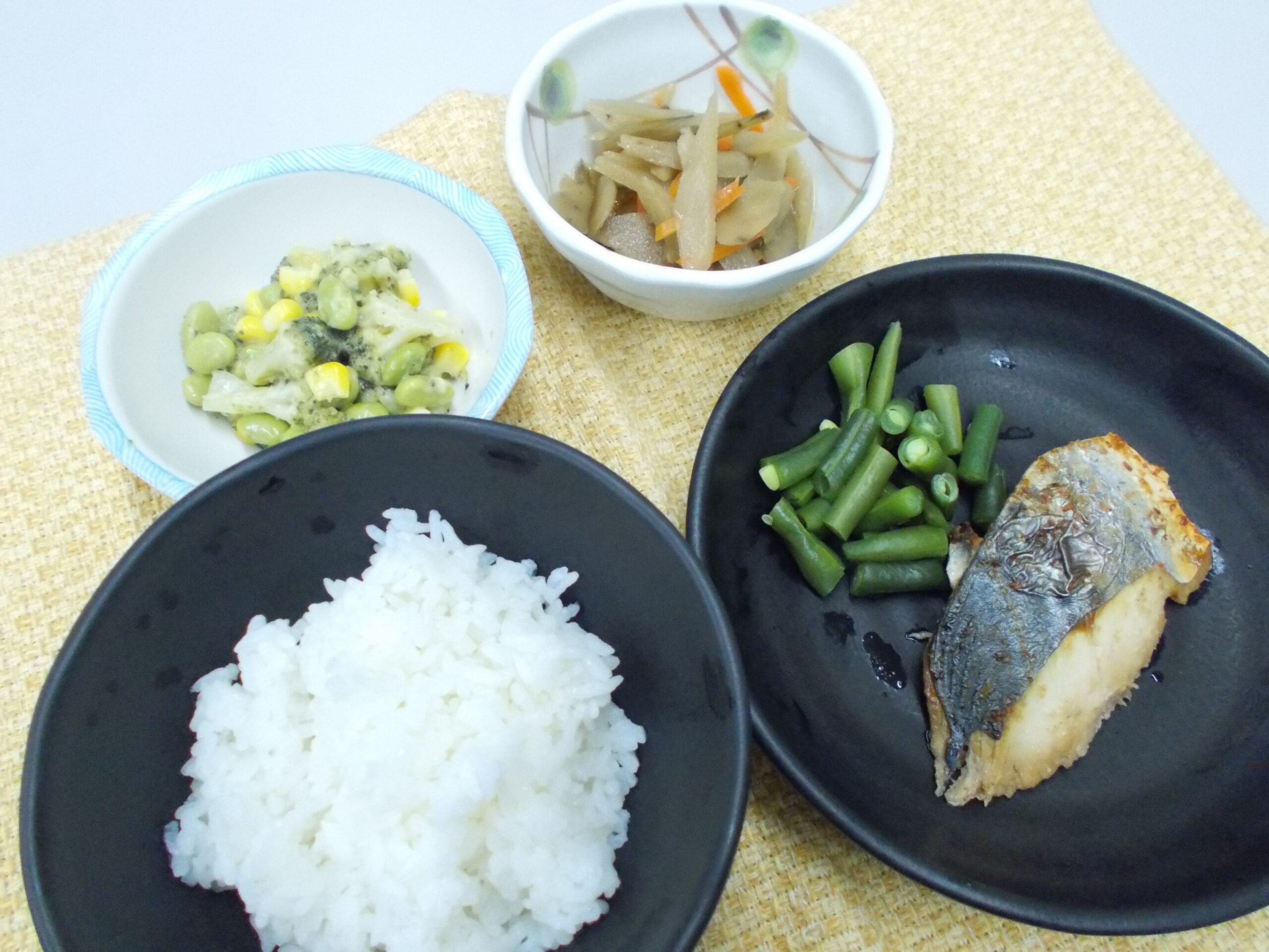 夕食 ご飯 さわらの利休焼き 金平ごぼう 枝豆とコーンのサラダ