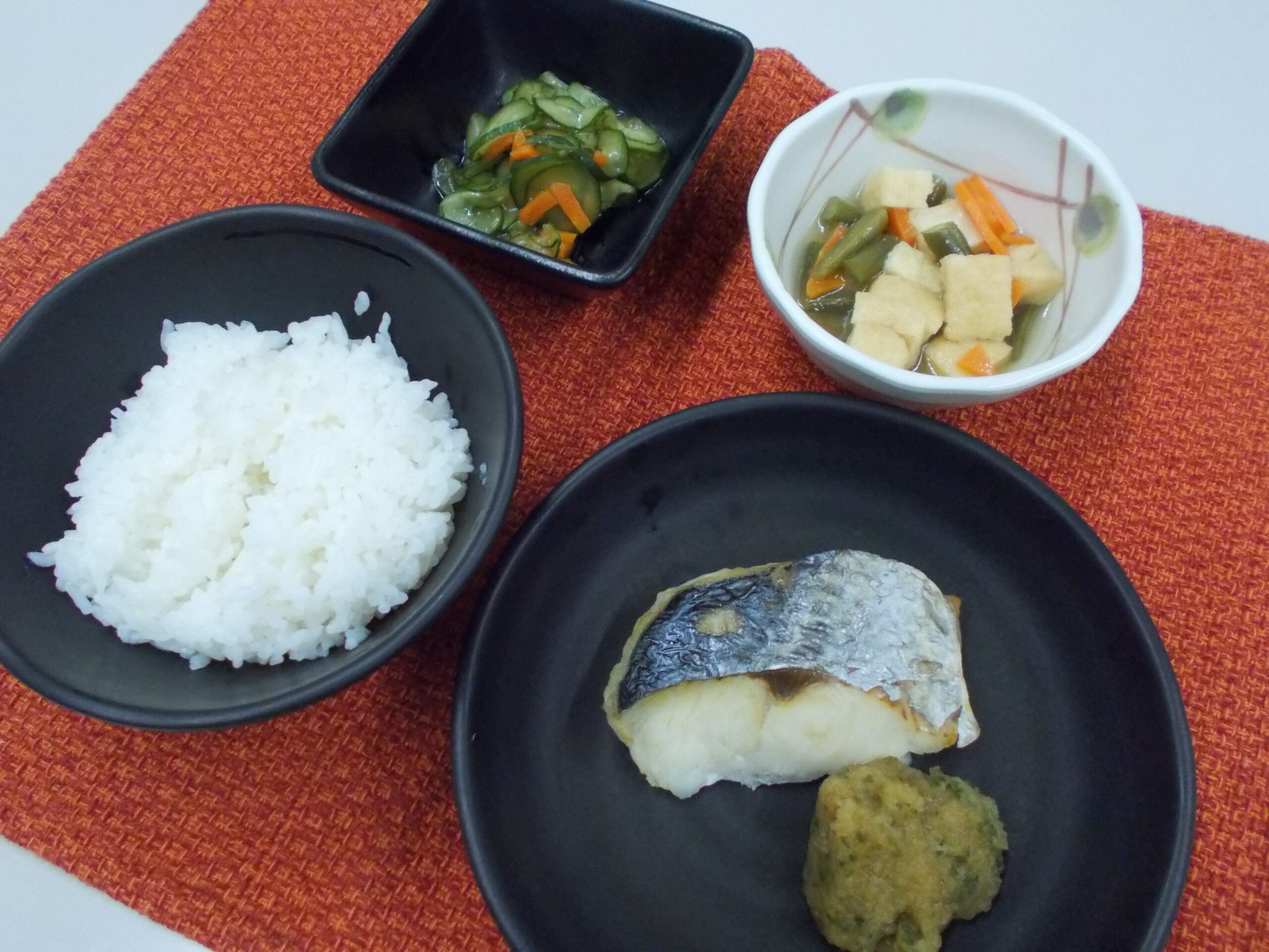 夕食 ご飯 さわらの塩焼き 厚揚げの煮物 きゅうりのドレッシング和え