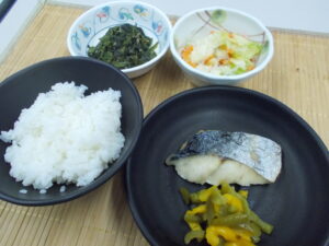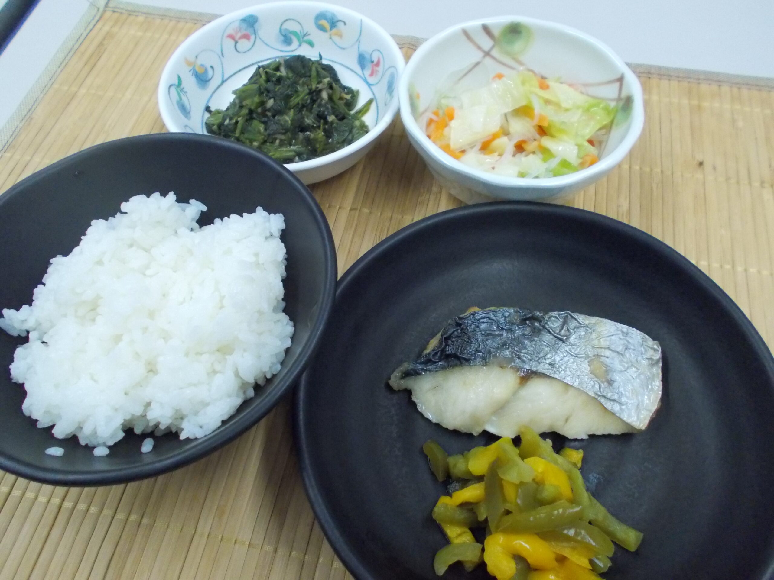 夕食 ご飯 さわらの塩焼き 春雨の炒め物 ほうれん草の海苔和え
