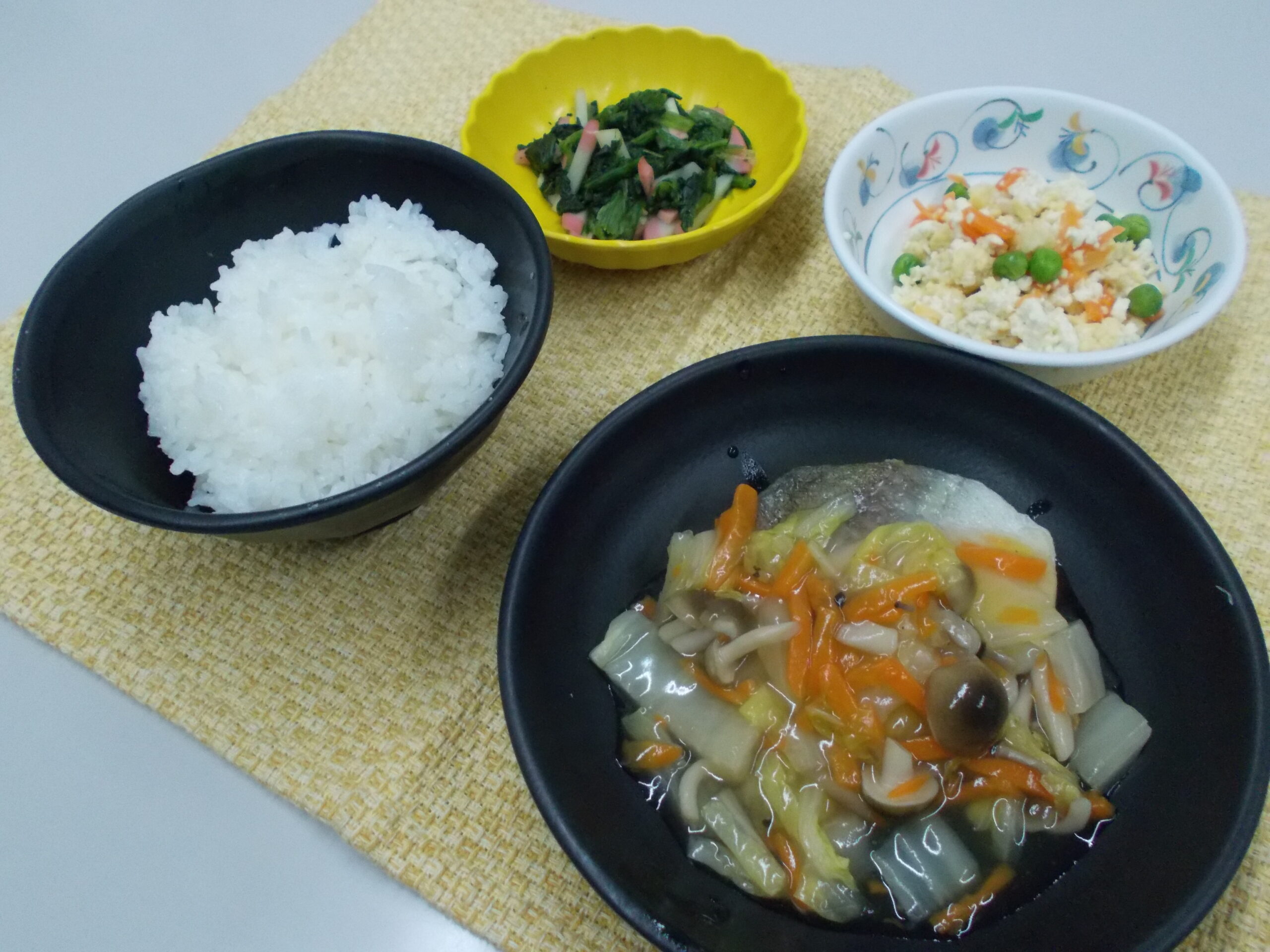 夕食 ご飯 たらちり風 炒り豆腐 ほうれん草の和え物
