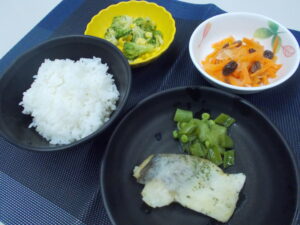 夕食 ご飯 たらのムニエル ブロッコリーのソテー キャロットラぺ