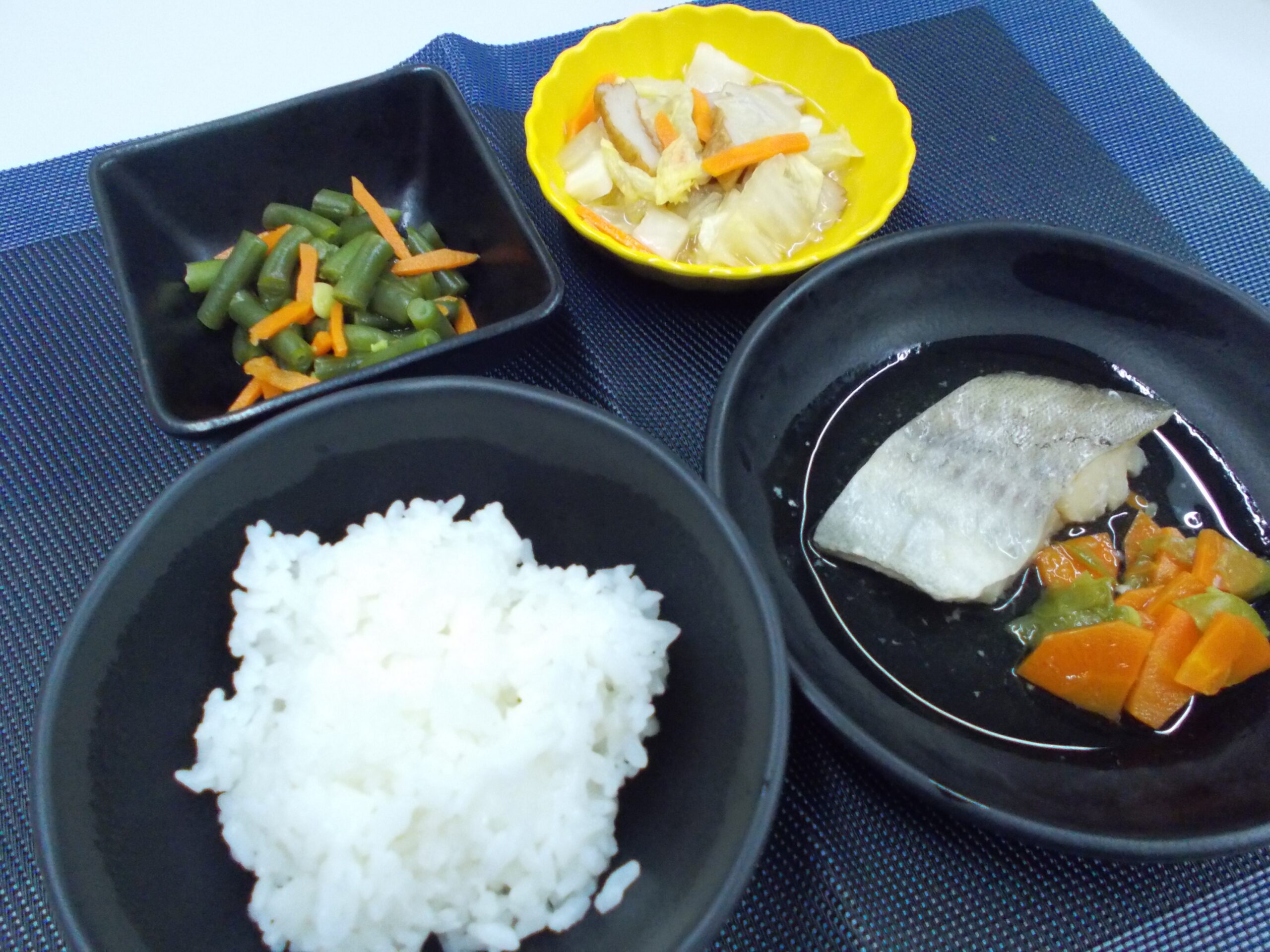 夕食 ご飯 たらの煮付け さつま揚げの煮物 いんげんのわさび和え
